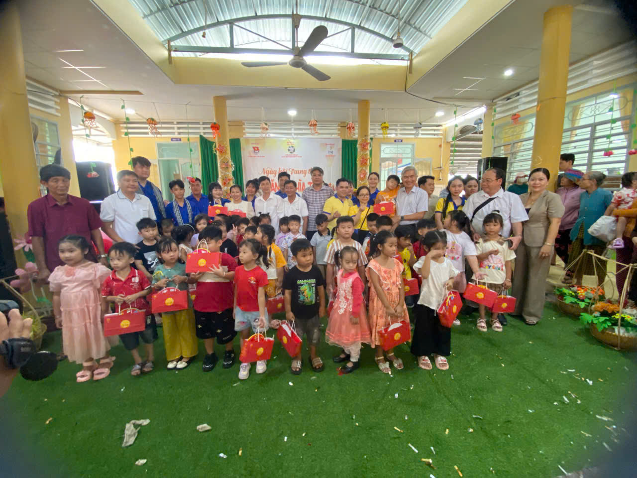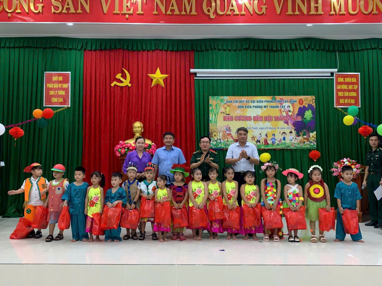 Chủ tịch UBND xã Đông Thành, Đồn biên phòng Mỹ Thạnh Tây, các mạnh thường quân  tặng quà trung thu tại Trường Mầm non Ánh Dương